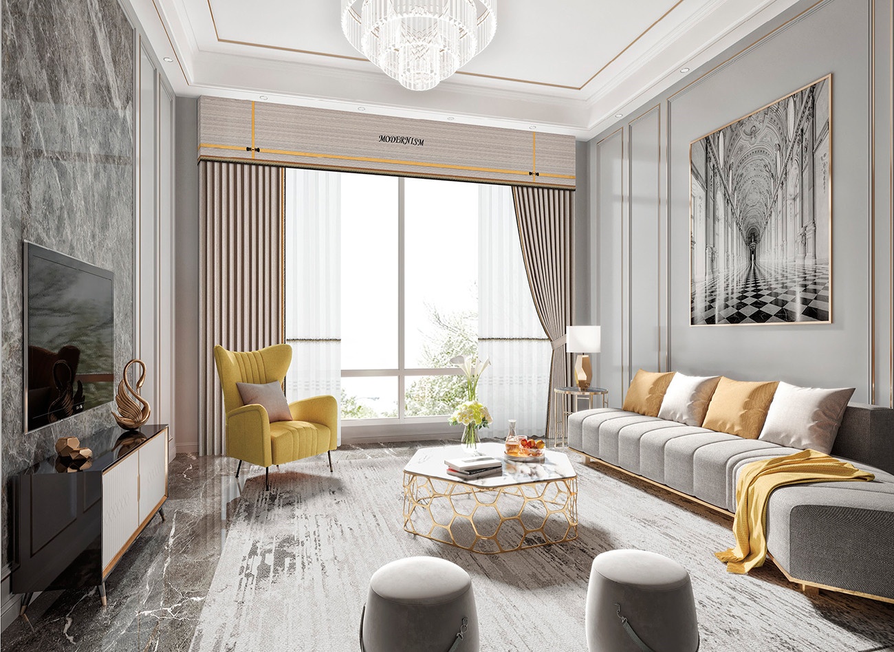 巖石灰傳達著自然的低調美感,鮮艷的螢黃色以利落的線條形式呈現,靈動與時尚兼具