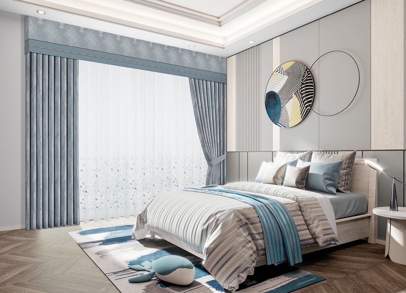以清雅的藍調為基底,菱格圖案交疊,形成萬花筒般的絢爛,演變出至美的繁花之境,空間變得奪目,令人心生向往。