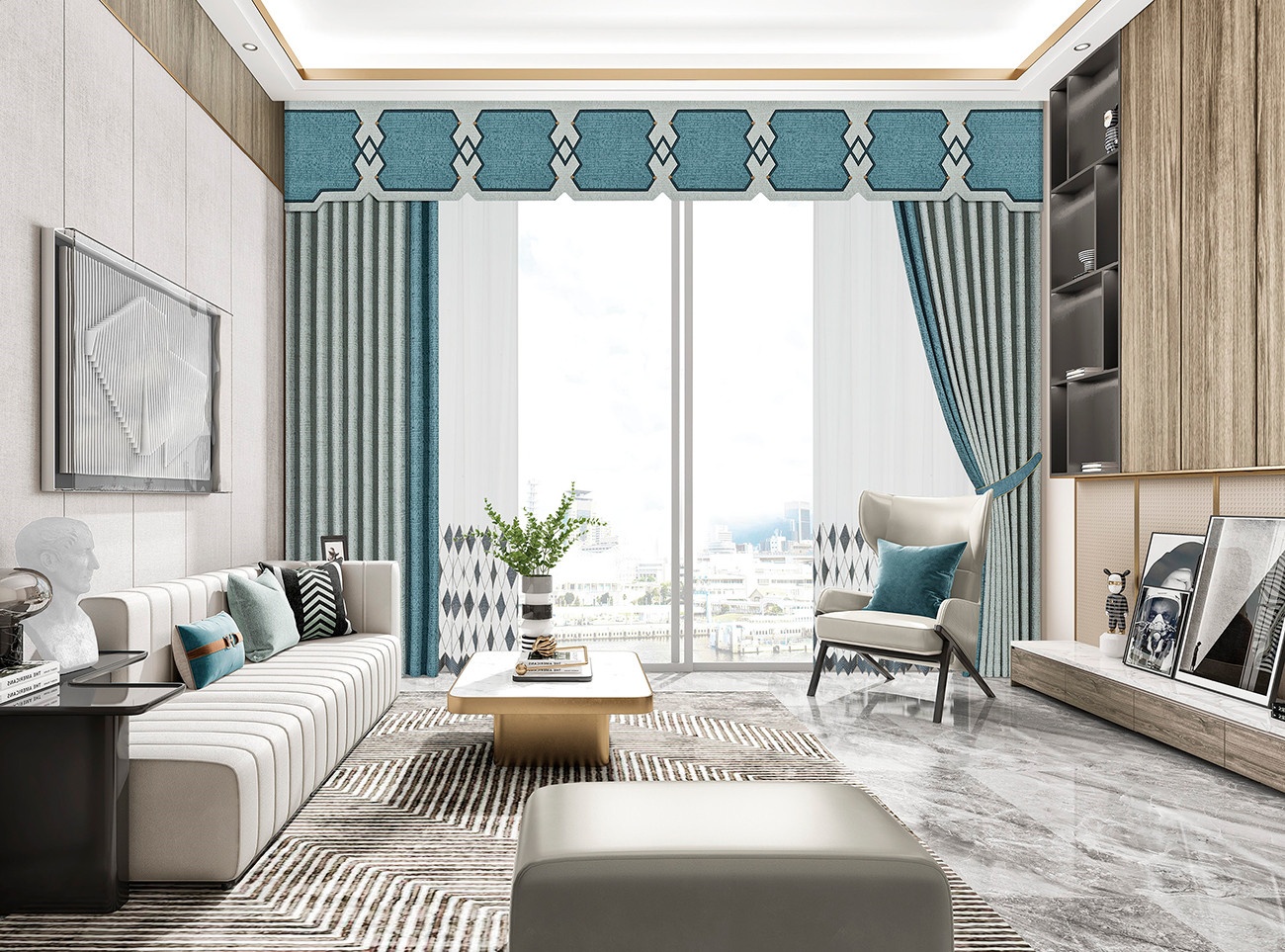 不同層次的天青與藍調交織,簡約的菱形幾何紋理讓人不禁想起如畫江南里的美麗窗欞。冷靜而浪漫的色彩相遇利落的線條,營造出典雅與高貴并行的氛圍。當端莊與藝術相遇,空間呈現出微妙的平衡與和諧,張弛自如,令人神往。