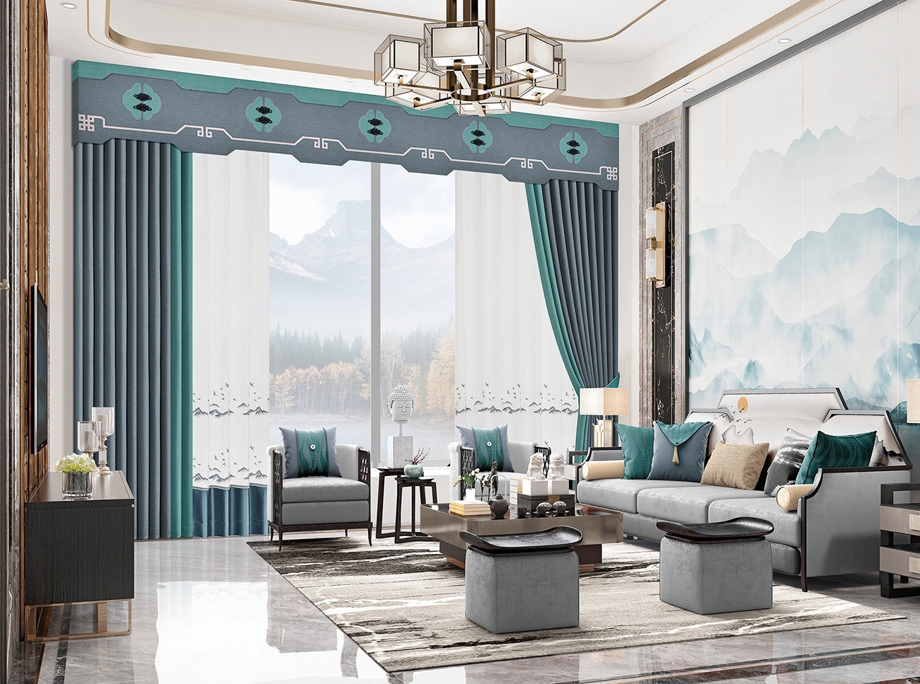 將傳統盤扣元素和回字紋用于窗簾,錯落有致排列,如詩一般的景致。富有變化的色彩與軟裝陳設,彌漫清新質樸的味道,清雅而溫馨的中式腔調展露無遺。橫豎分明的空間勾勒,呈現東方簡雅氣質,不落塵俗。